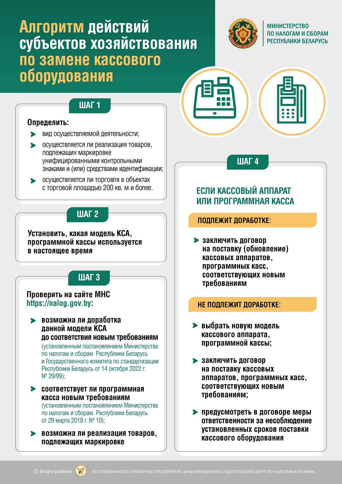 Справочно. Информация о доработанных до новых требований моделях кассовых суммирующих аппаратов и программных касс размещается на сайте МНС в разделе Налоговый контроль/Контроль за приемом средств платежа и использованием кассового и иного оборудования/Перечень кассового оборудования, которое соответствует новым требованиям (https://nalog.gov.by/tax_control/payment_control/list_of_models/). В информации указываются контактные данные операторов программных кассовых систем и производителей кассовых суммирующих аппаратов.