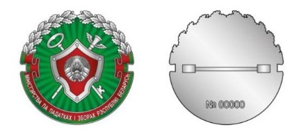 Верхняя часть внешней стороны нагрудного знака обрамлена дубовыми ветвями серебристого цвета, нижняя – девизной лентой красно-зелёного цвета с надписью "МIНIСТЭРСТВА ПА ПАДАТКАХ I ЗБОРАХ РЭСПУБЛIКI БЕЛАРУСЬ" серебристого цвета.